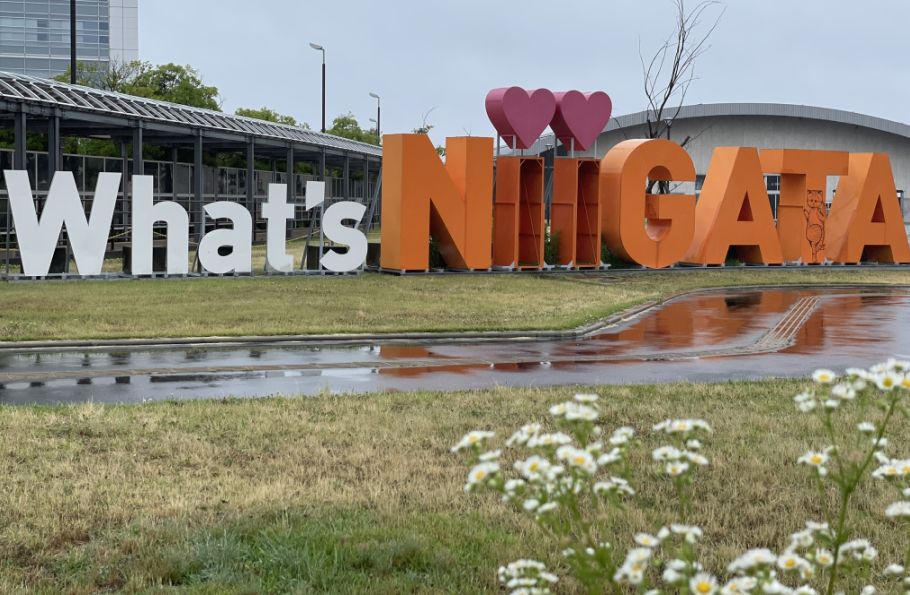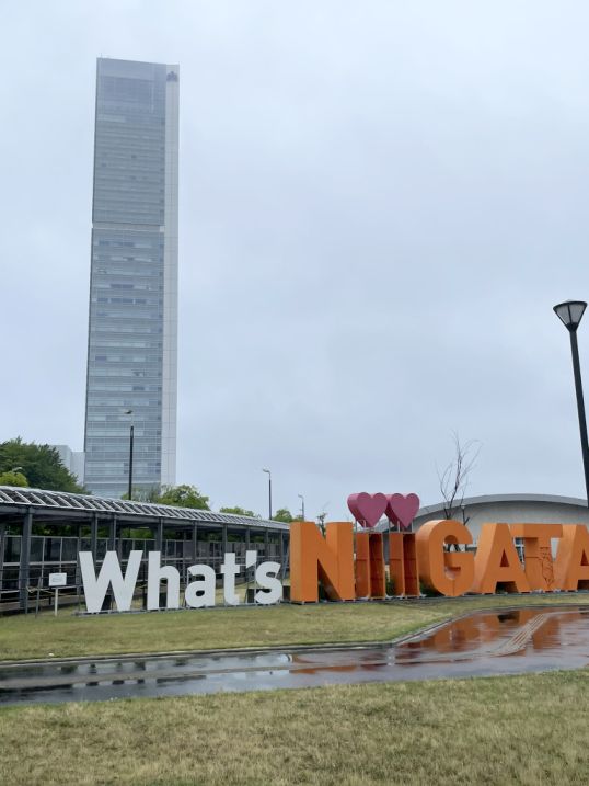 When we walked back toward the hotel, the quiet riverside slowly gave way to the modern waterfront again. Behind the building, a huge sign caught my eye: “What’s Niigata”, written in bold white and bright orange letters.