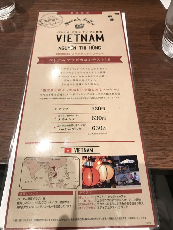 ![]() The coffee beans are imported from Vietnam. A cup of coffee is 530 yen, which is around $5 and if you want a refill it is 50% off on the 2nd cup. |