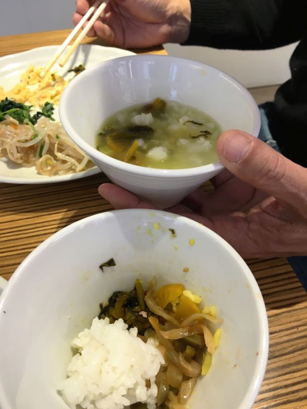 ![]() Porridge and a bowl of rice with pickled vegetables. |
