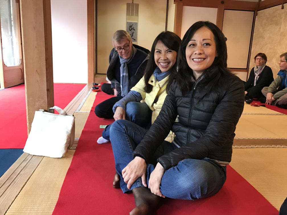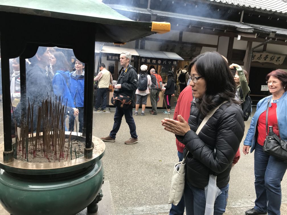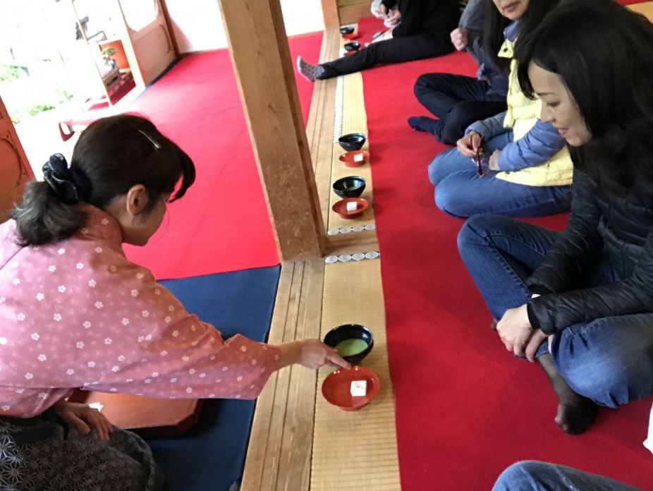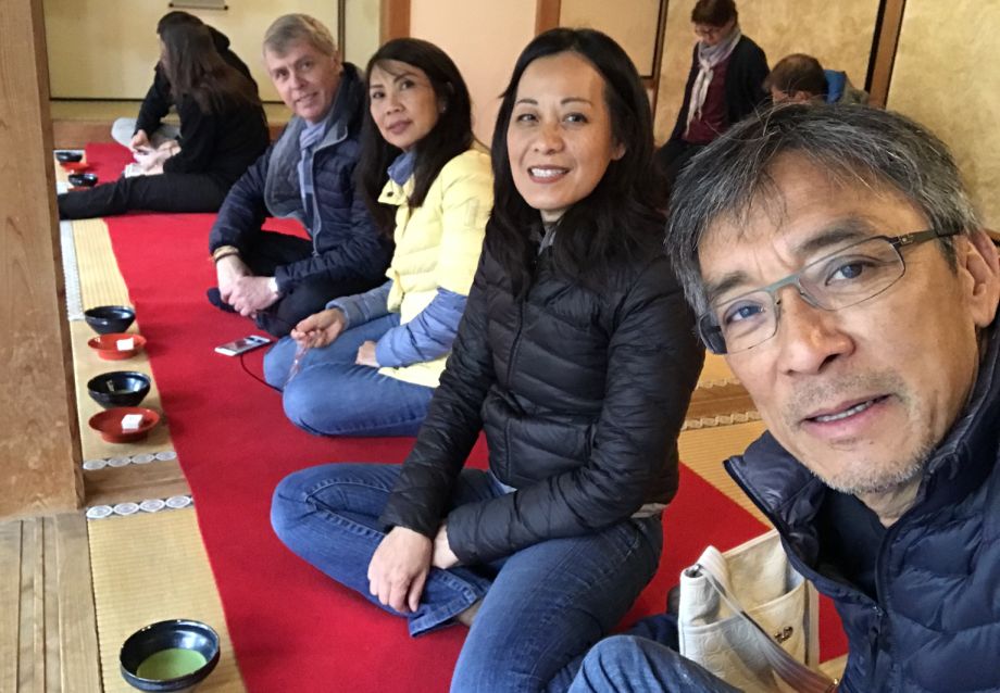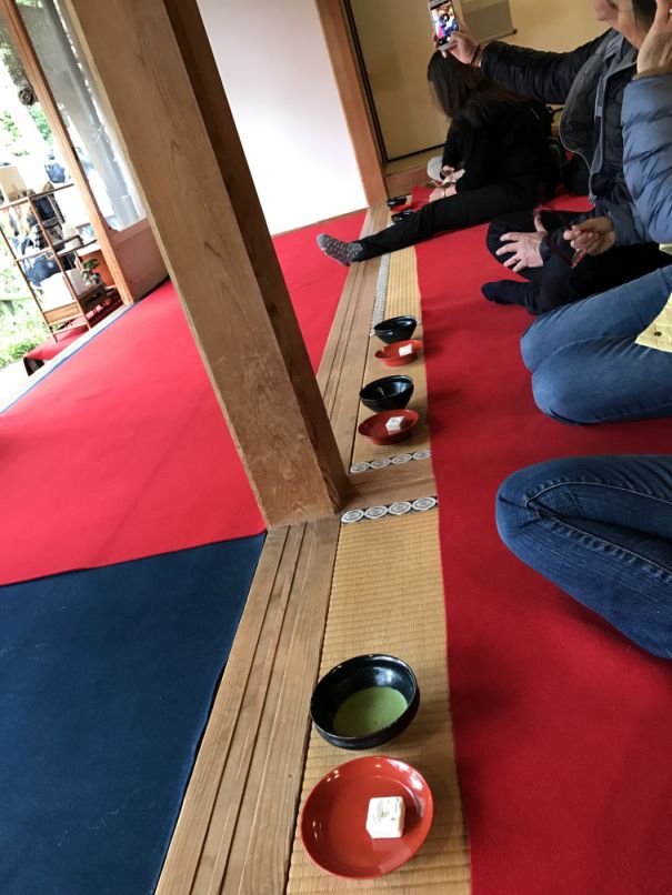 Tea houseWe are now outside the exit and there are souvenir shops, a small tea garden where you can have matcha tea and sweets (500 yen). Thierry wanted to give it a try so here we are having traditional Japanese tea.