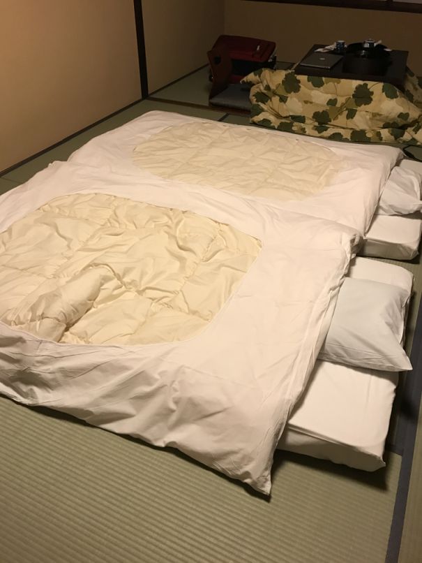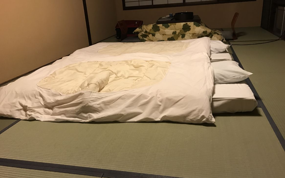 Japanese beds consist of a futon (Japanese mattresses) laid directly on the tatami floor. The futon will not be laid out when you first enter the room. Instead, they are kept in the closet during the day to be set out in the evening and put away again in the morning by the ryokan staff.