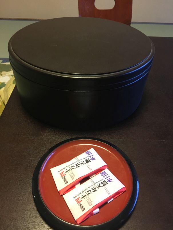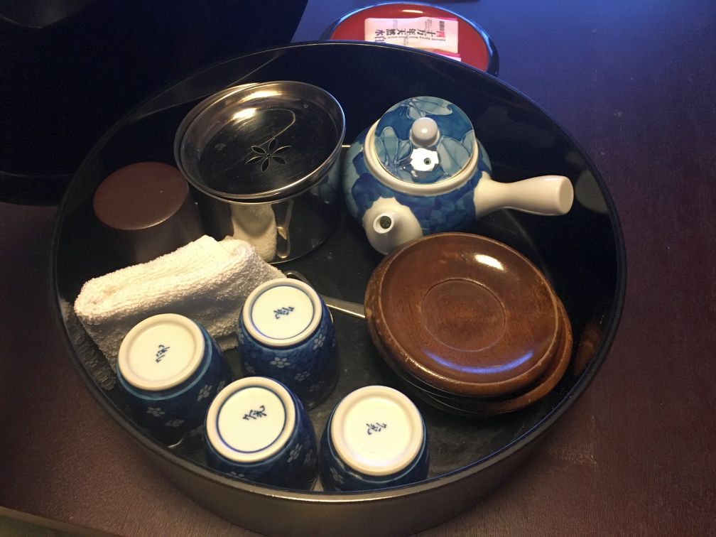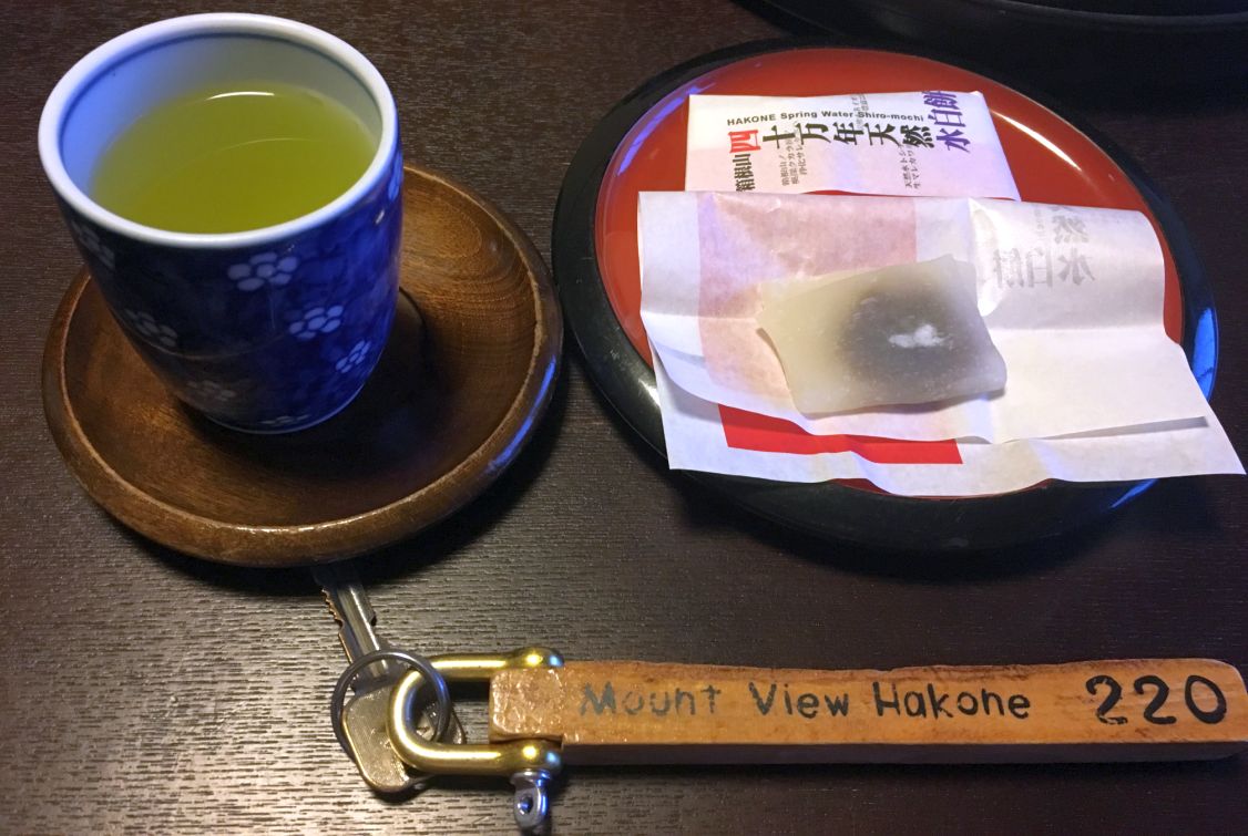 On the table is a large wooden box containing tea service and a tray of mochi - all complimentary of the hotel.