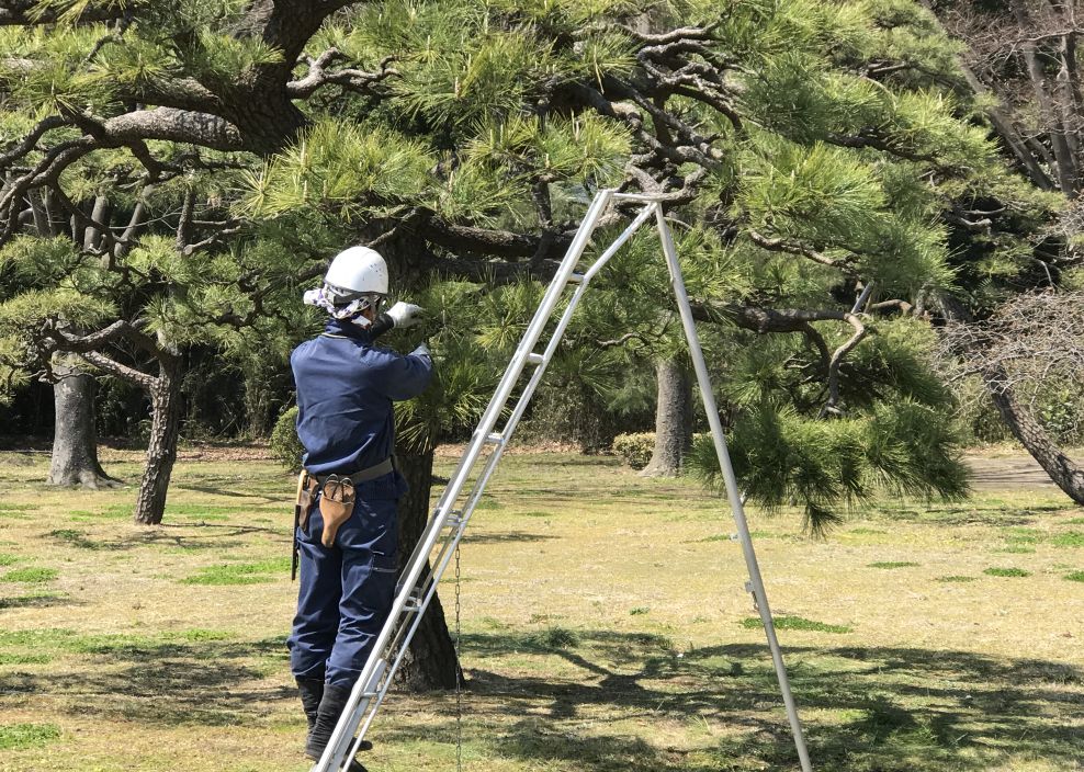 A worker trimming a pine tree by hand.