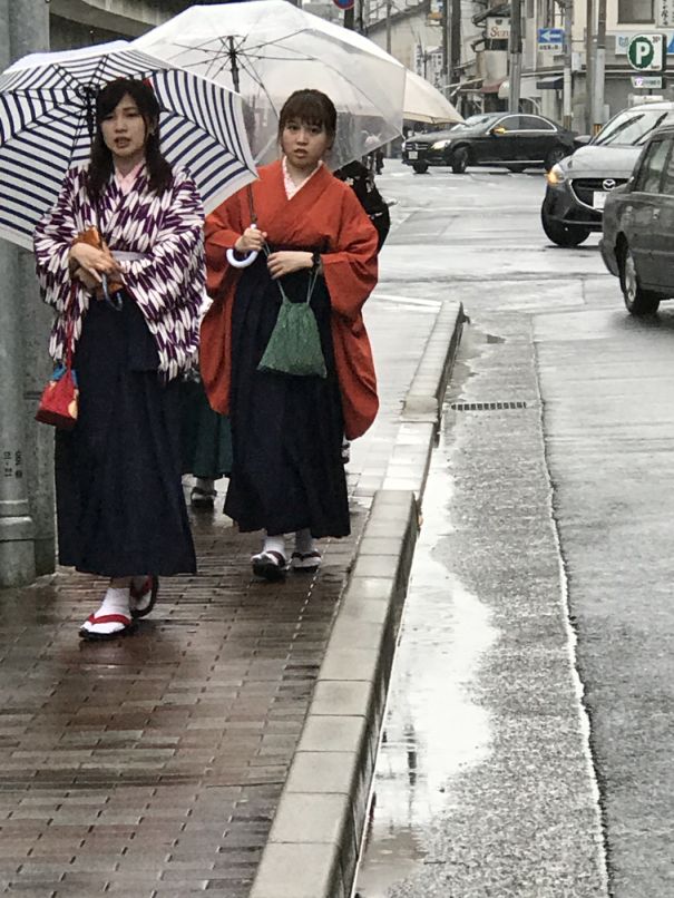 Girls wearing traditional Japanese clothes walking the street close to our apartment.