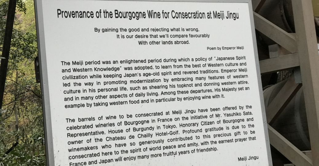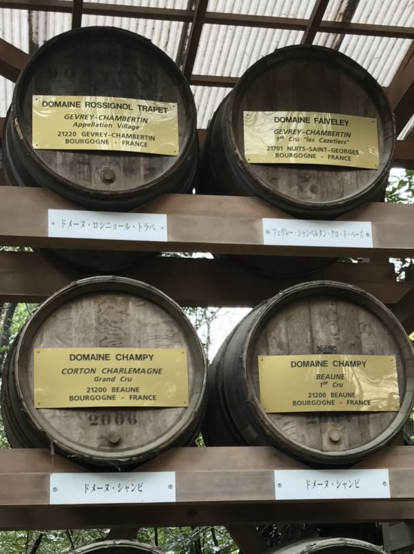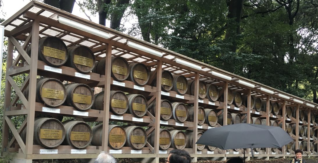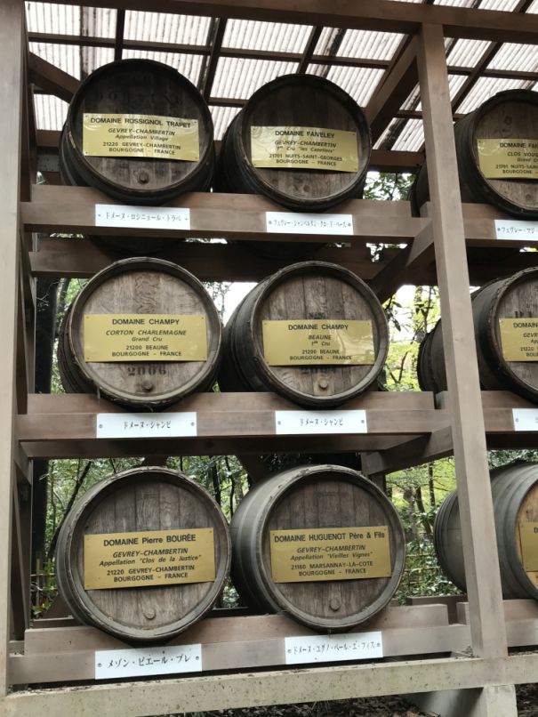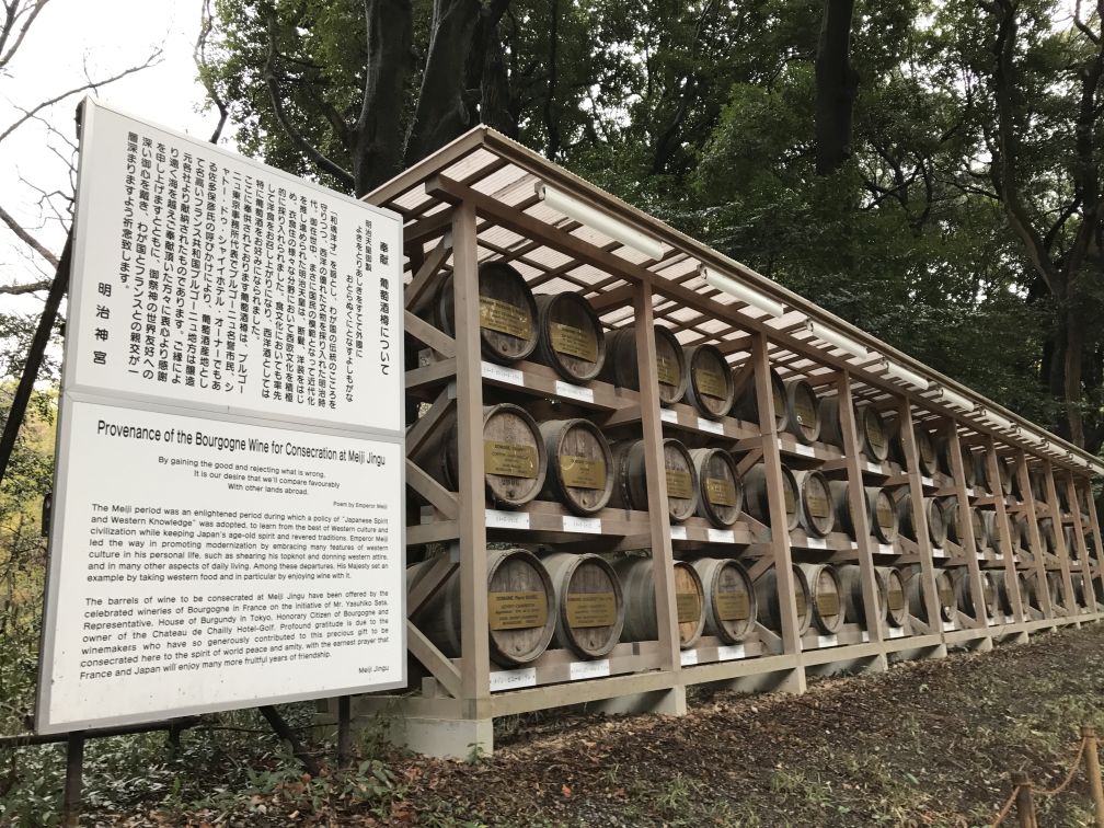 60 wine barrels neatly arranged in an organized fashion and marked by significance of the barrels. The Meiji emperor believed in taking the good from other lands and rejecting the bad. In an endeavor to promote modernization while also keeping Japan’s age old spirit and traditions, he adopted many of the western features and set an example by taking western food and in particular enjoying wine with it. Thus, in his honor, the French contributed these barrels of wine which today stand as an earnest prayer in peace and amity amongst the two countries.