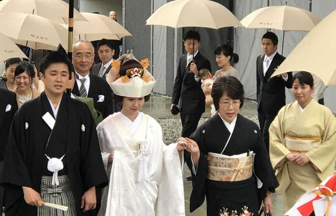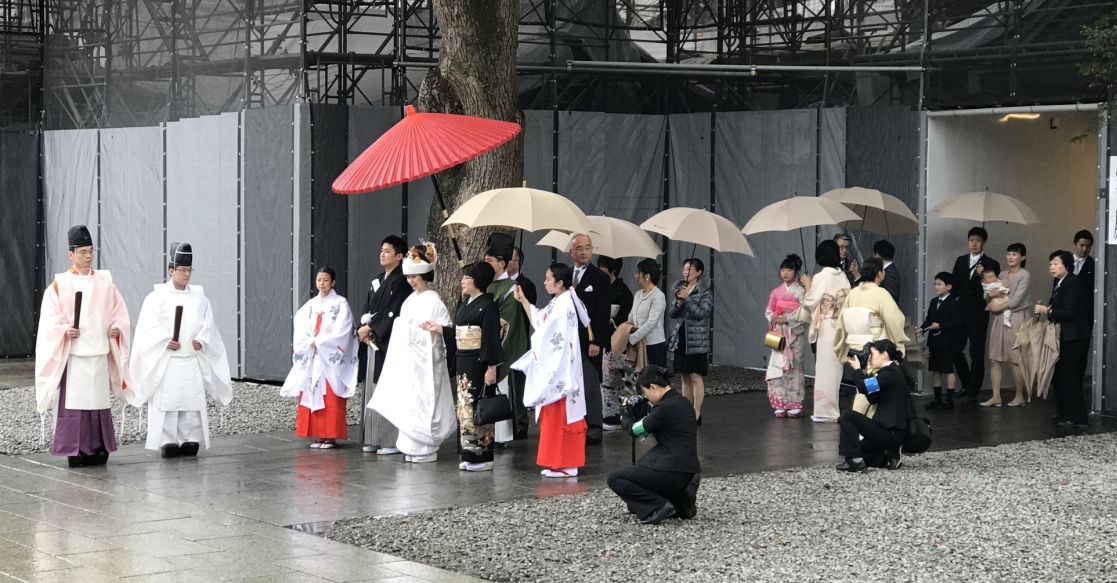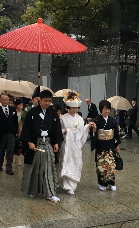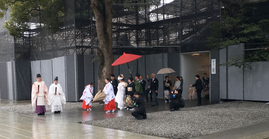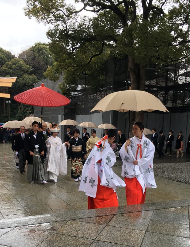 The bride in a white kimono and the groom in his formal black robe, walking together under a big red parasol, with Shinto priests leading the way and the rest of the wedding party trailing behind.