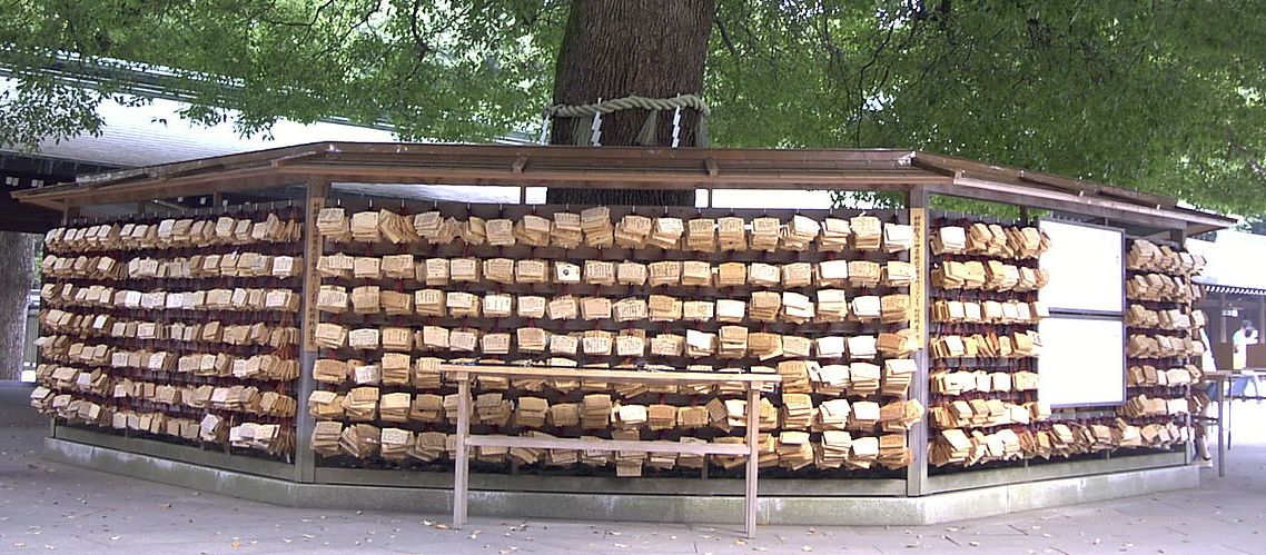 wooden wishing plaques on which worshippers write their prayers or wishes. The