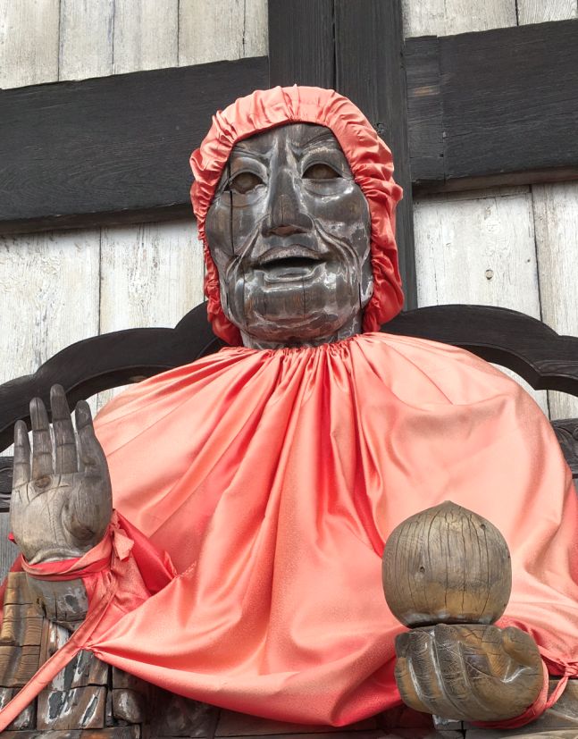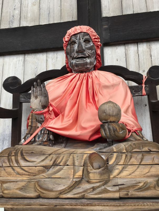 This is a really large wooden statue of Binzuru seated in a lotus position.