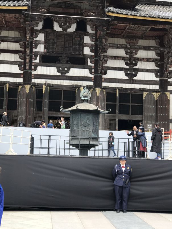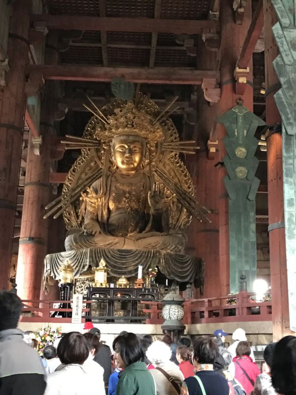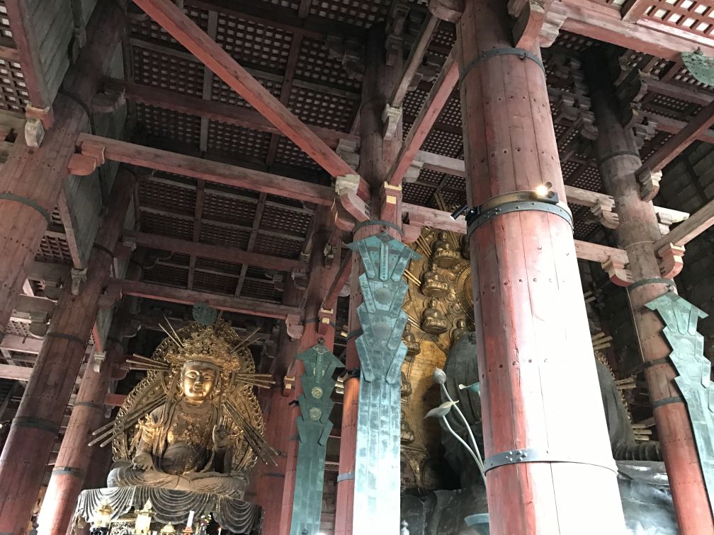 As soon as you walk in Todai-jii's you will see the main hall with the Big Buddha, Daibutsuden. Todai-ji which is the world's largest wooden building, despite the fact that the present reconstruction of 1692 is only two thirds of the original temple hall's size. The massive building houses one of Japan's largest bronze statues of Buddha. The Buddha weighs some 500 tons, towering 49 feet tall, and with a 17.5 foot-long face. His hair is made of 966 individual bronze balls. Creating this massive bronze Buddha occupied much of Japan’s bronze production during the 700s, which nearly bankrupted Japan in 751 Is now part of the Unesco World Heritage and Monuments of Ancient Nara and National treasure