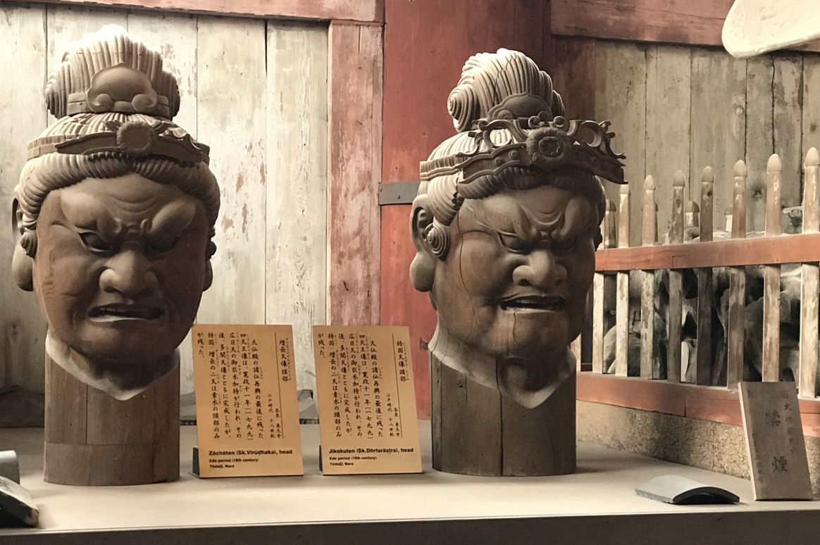 On the left is the head of Zochoten (Sk. Virudhaka), Lord of the South , and on the right is the head of Jikokuten, Lord of the East (Sk. Dhrtarastra) both from the 18th century.