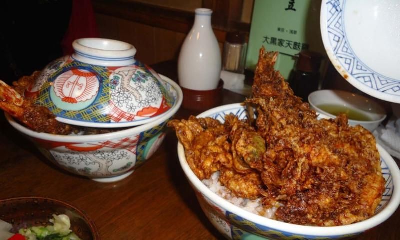 Tempura restaurants in Asakusa, famous for Tendon (Tempura rice bowl).