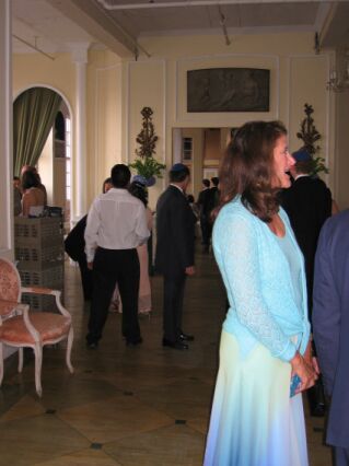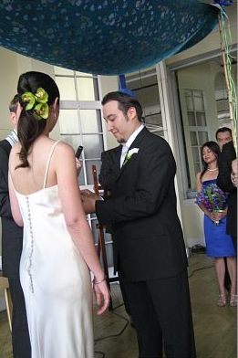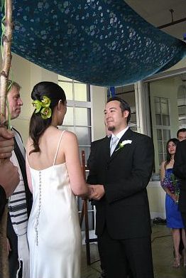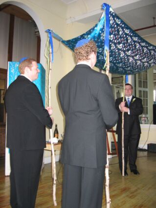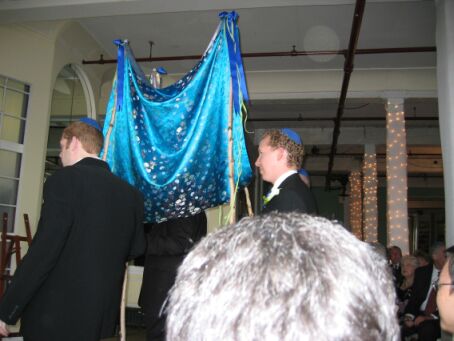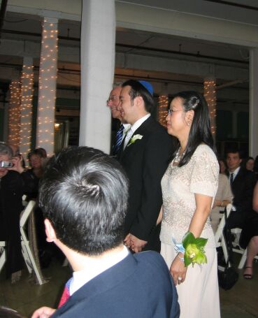 The entrance of the Groom's men carrying the Chupah (canopy). Note that the fabric is made out of Chinese silk representing the Asian heritage on both side. The wedding ceremony takes place under the Chupah, a symbol of the home to be built and shared by the couple. It is open on all sides to welcome friends and relatives in unconditional hospitality.
