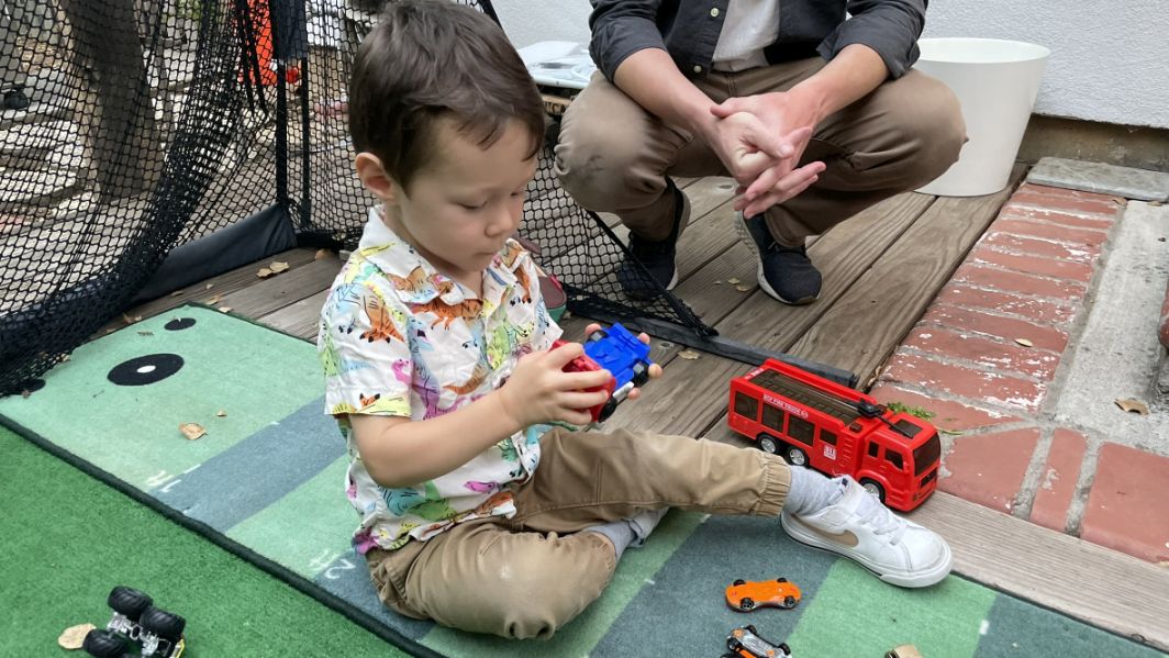 Off to the side, a cozy corner that was originally set up for Golfputting but it became a fun place where kids played with toys while their parents sat nearby, enjoying the cheerful scene.