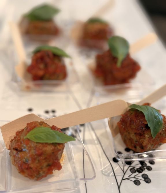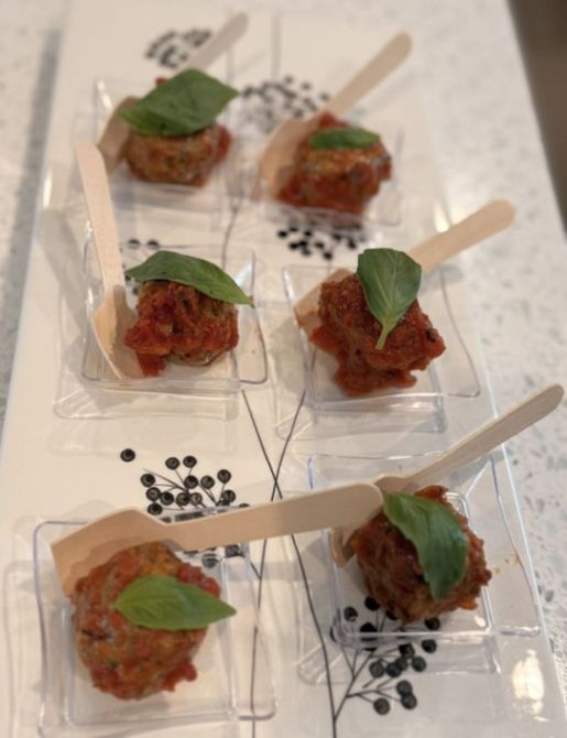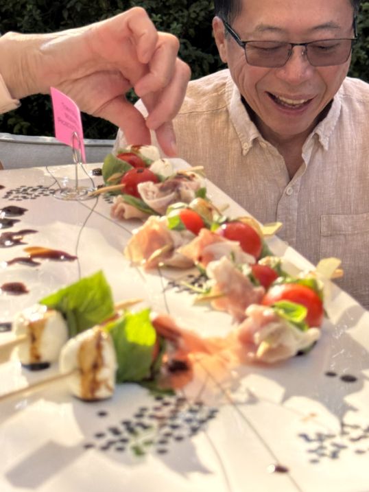 Mozzarella, tomato, basil, prosciutto skewers drizzled with balsamic vinegar.