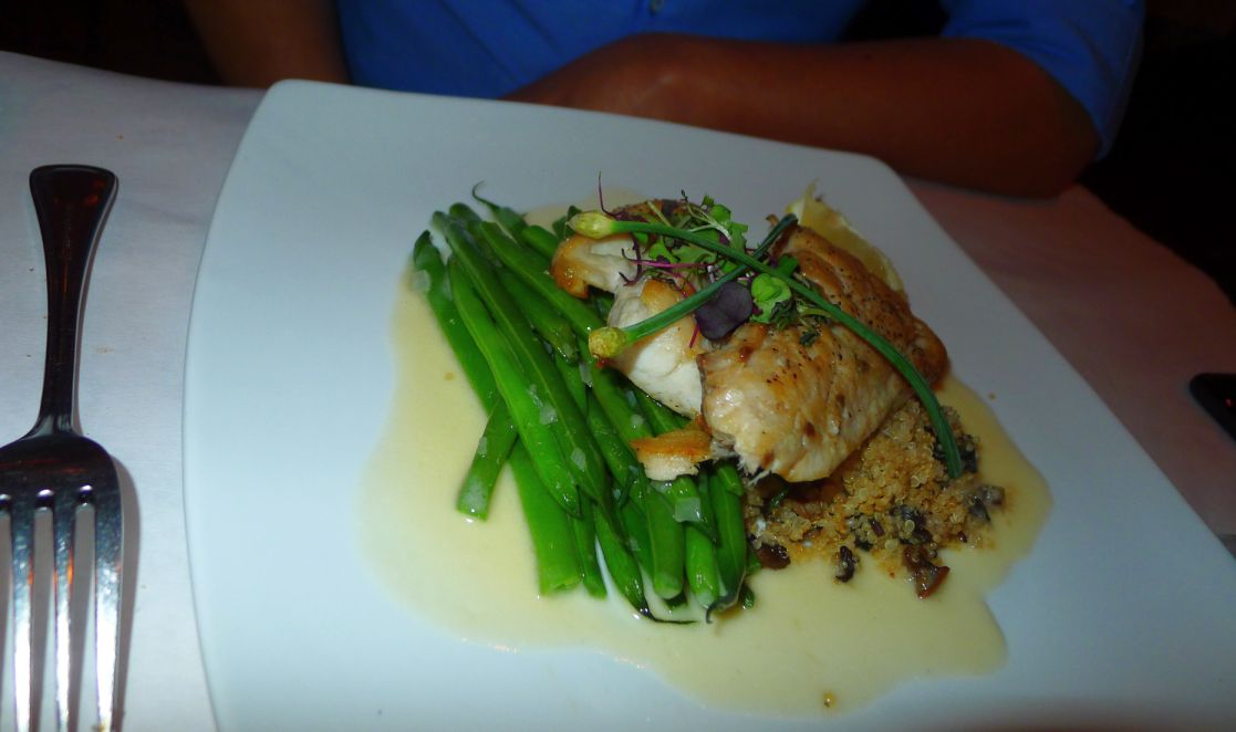 Vinh ordered the special of the day: pan seared sea bass with haricot vert and couscous