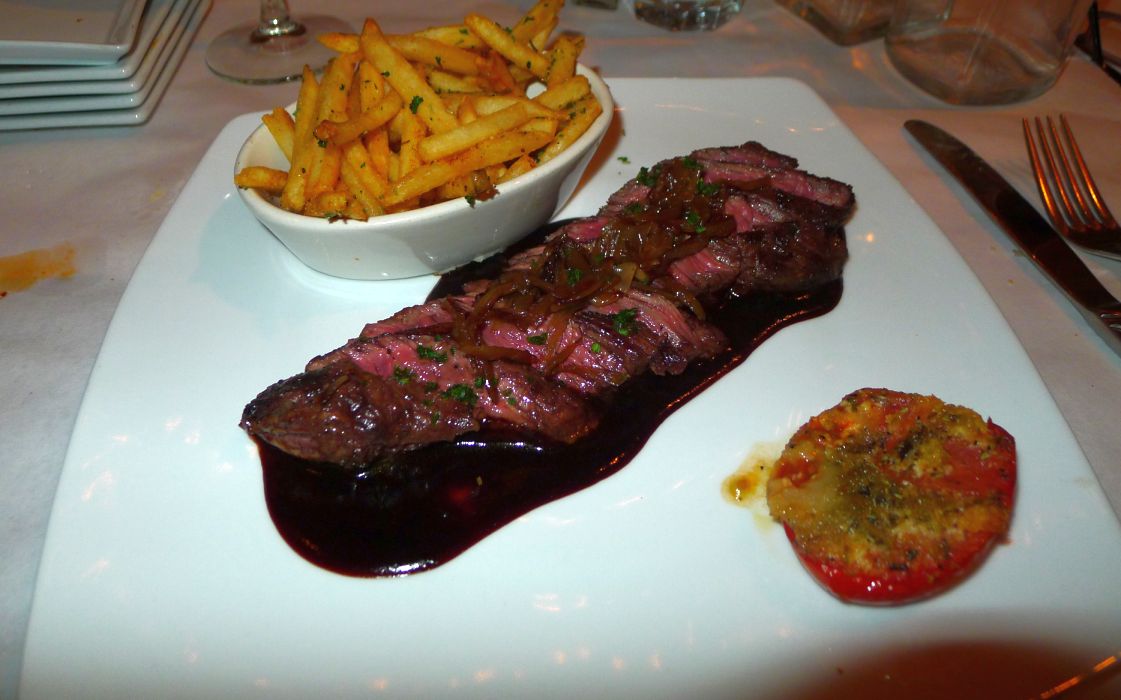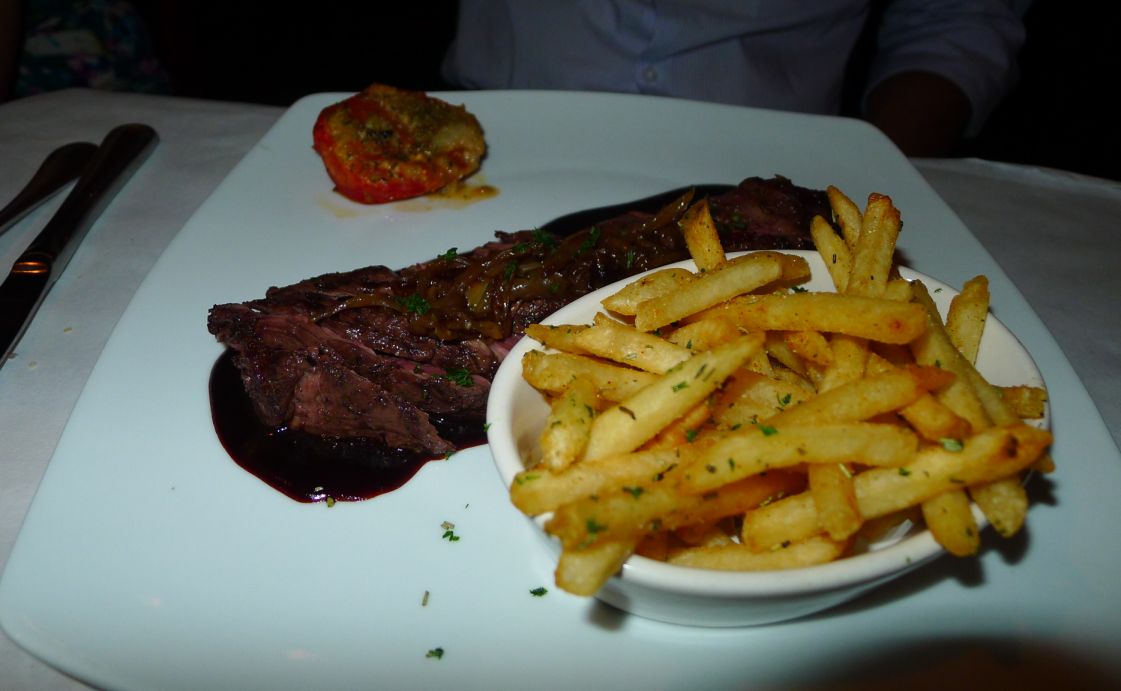 Hoa ordered the Steak frites, beef hanger, red wine, shallots, fries