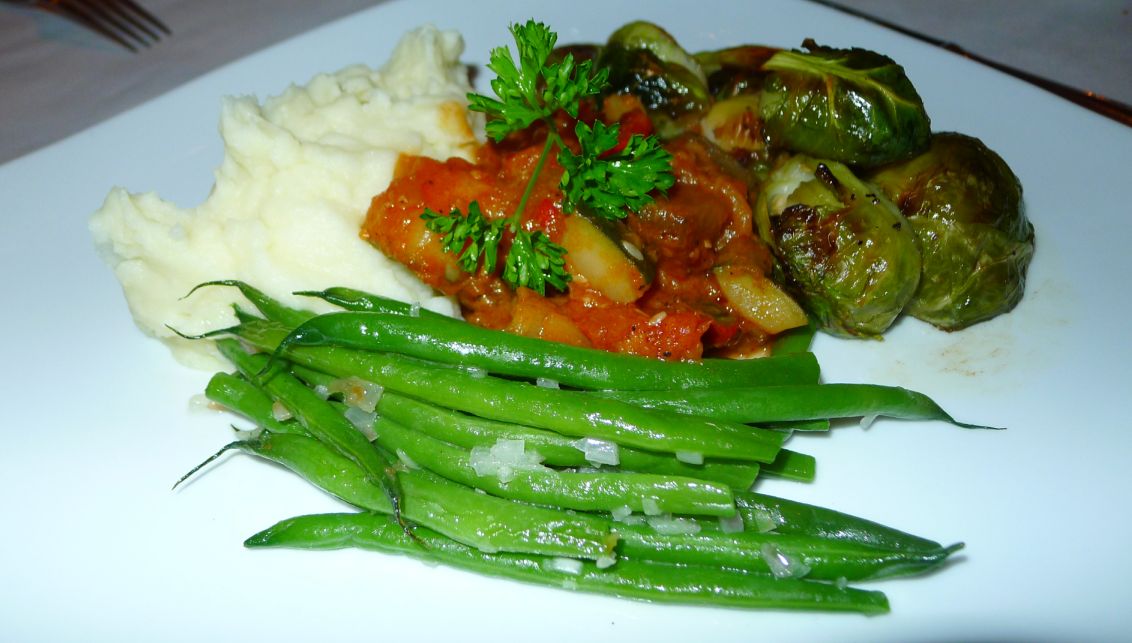 Tina ordered a vegetable platter with haricot vert, ratatouille nicoise, Brussels sprout and mashed potatoes.