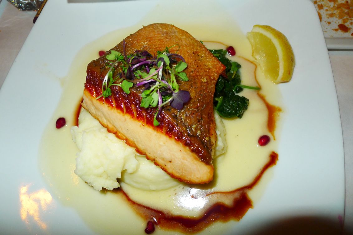 Kristie ordered the Salmon, balsamic butter sauce, pomegranate, spinach
