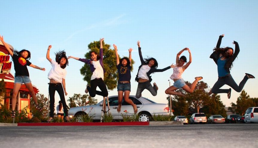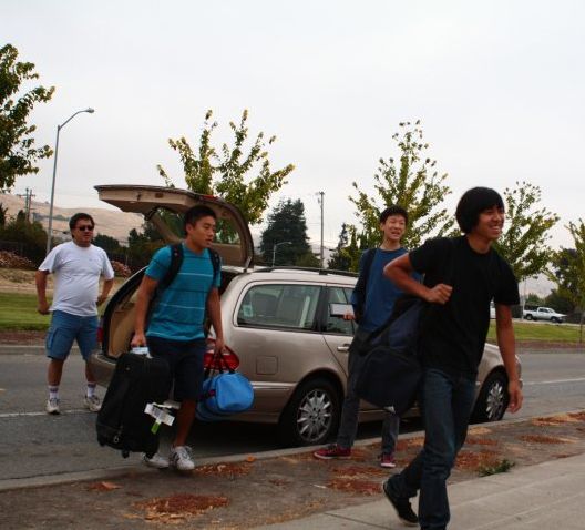 Kevin and friends arriving at the school parking lot. The bus will pick them up at the school parking lot. |