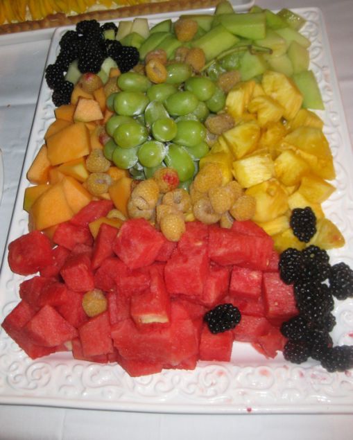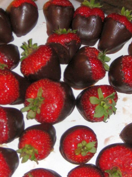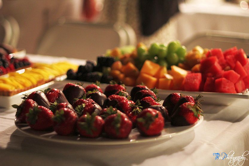 Strawberries dipped in chocolate and large fruit tray from Hanh.