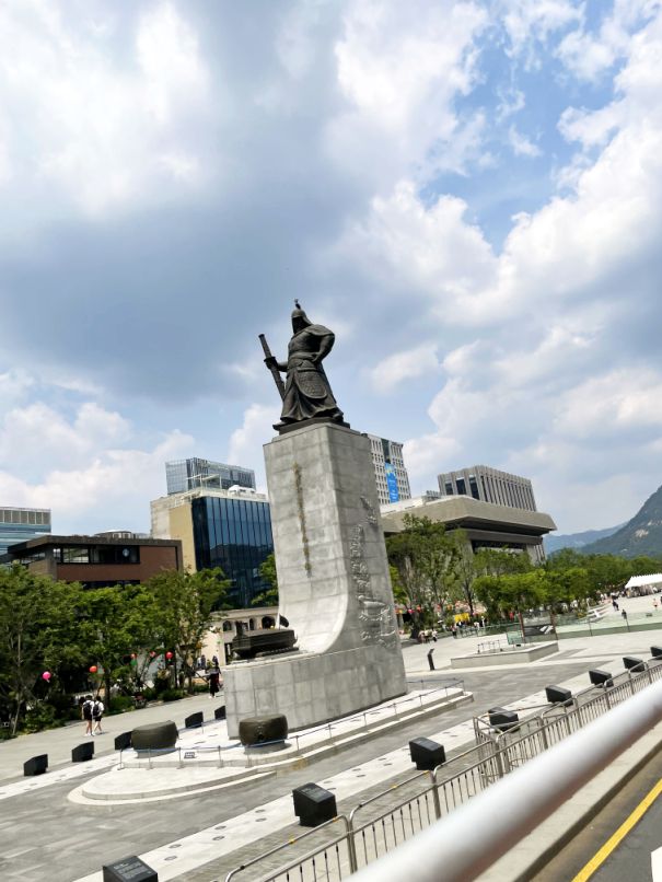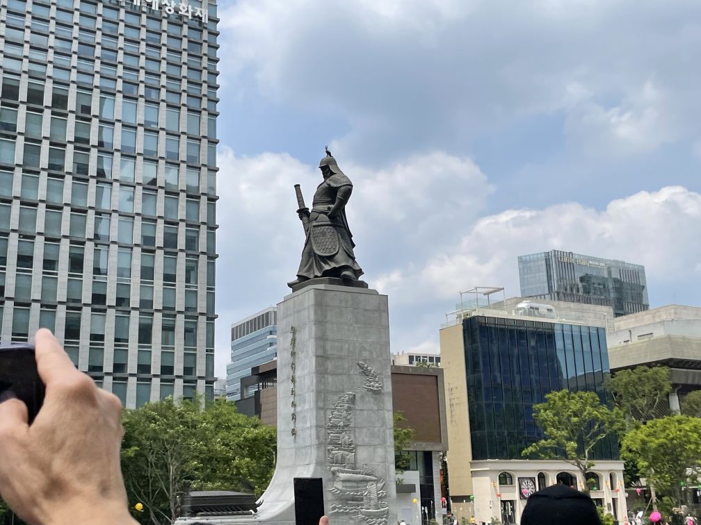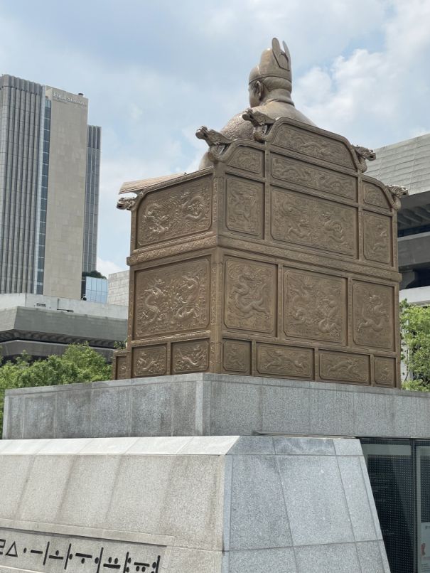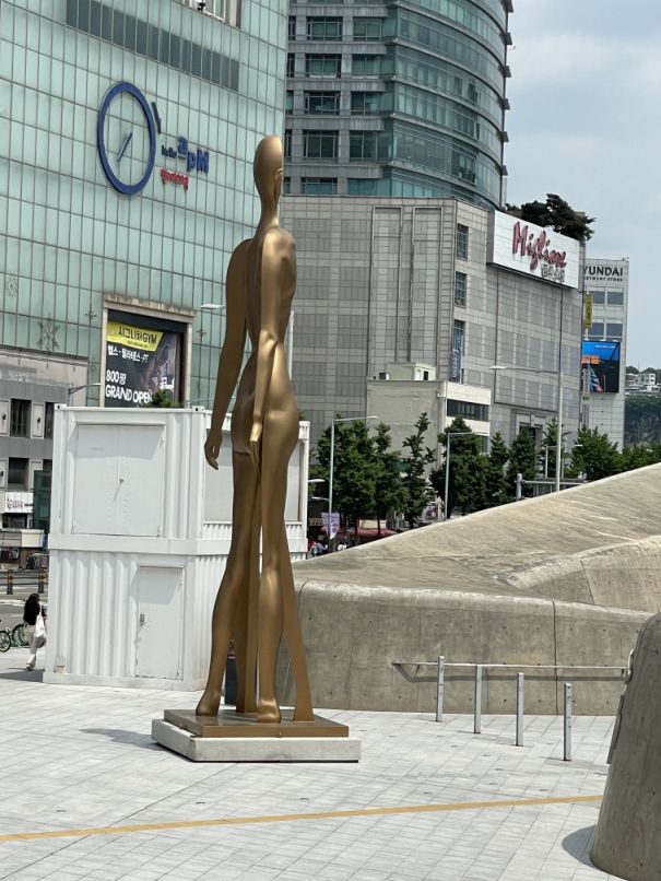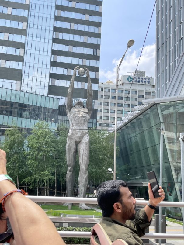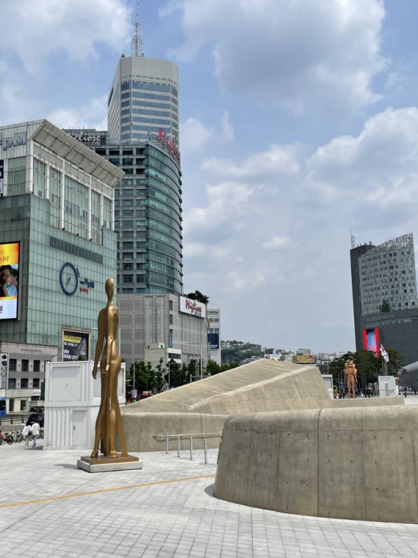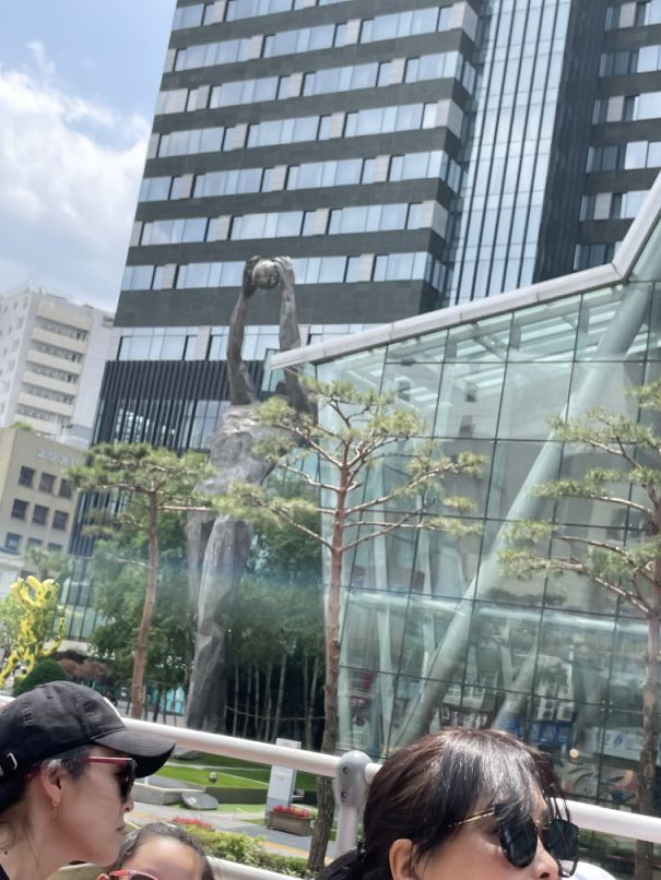 The bus is now leaving and we passed by a large bronze statue in front of Dongdaemun Design Plaza (DDP)