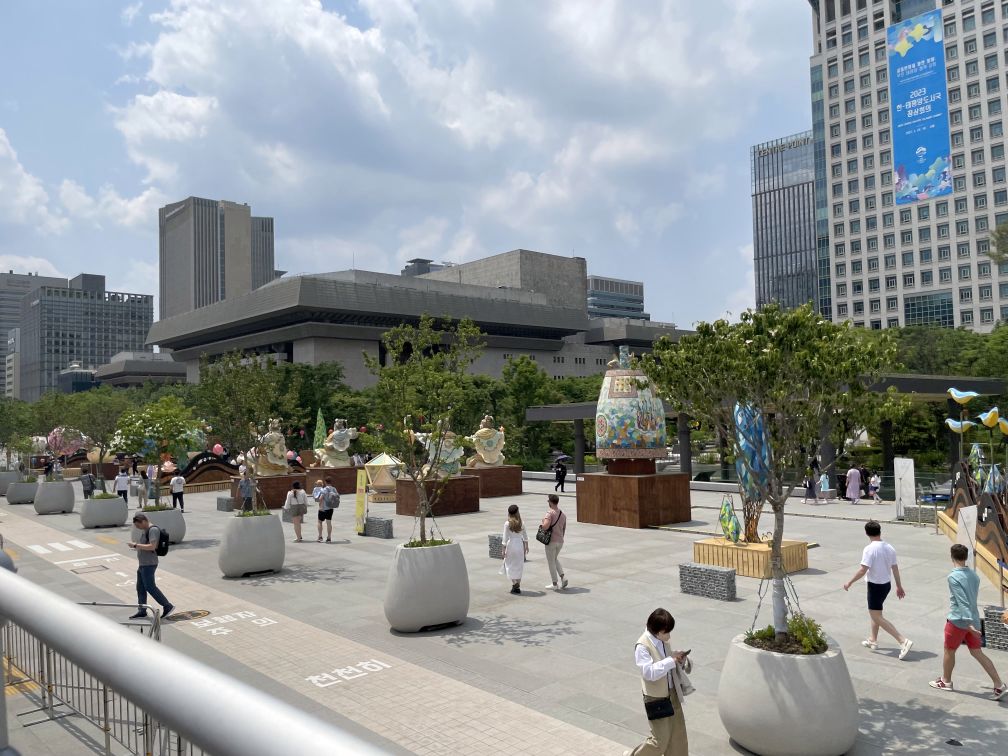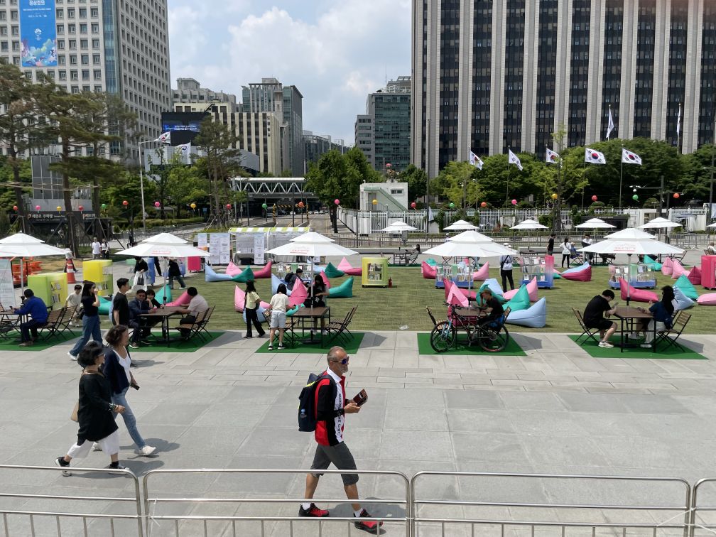 Seoul outdoor library in Gwanghwamun square with colorful giant bean bags for people to sit.