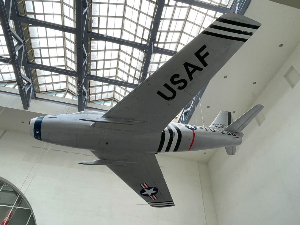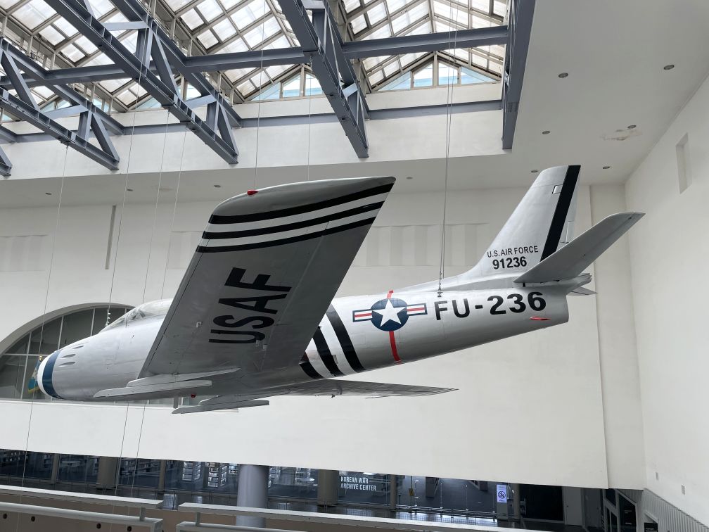 The F-16 "Sabre" was the latest jet fighter at the time. Deployed by the US Airfoce in December 1950 in response to the Soviet mad MiG15 that threatened the airspace over the Korean peninsula.