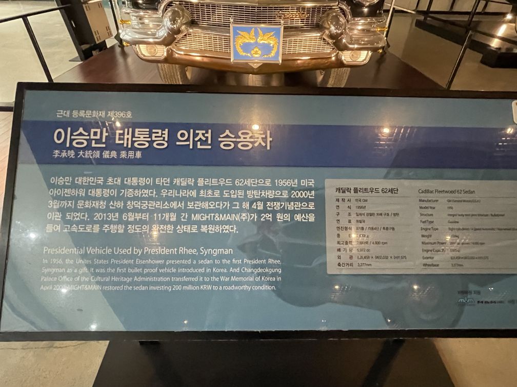 In 1956, the United States President Eisenhower presented a sedan to Syngman Rhee, the first President of South Korea as a gift. It was the first bullet proof vehicle introduced in Korea. Changdeokgung Palace office and the Cultural Heritage administration transferred the car to the War Museum of Korea in April 2009. The sedan was restored to roadworthy condition.