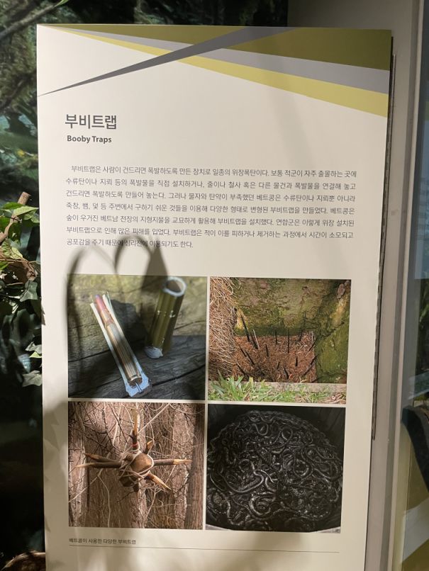 The terrain and climate in Vietnam was one of the most significant elements in determining the aspects of the war. The sweltering heat with high humidly and tropical jungles per se were the obstacles to the U.S> and ally troops. The troops sustained severe damage by Vietnamese booby traps (2nd picture), guerilla tactics and underground caves.
