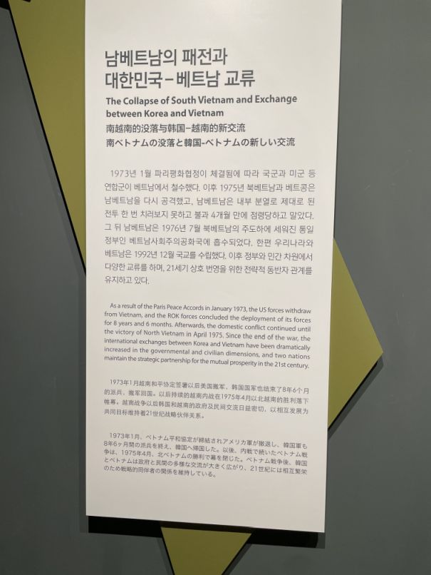 As the result of the Paris Accords in January 1973. the U.S. forces withdraw from Vietnam, and the ROK forces concluded the deployment of its forces.. Afterwards, the domestic conflict continued until the victory of North Vietnam in April 1975. Since the end of the war, the international exchange between Korea and Vietnam have been dramatically increased in governmental and civilian dimensions, and two nations maintain the strategic partnerships for the mutual prosperity in the 21st century.