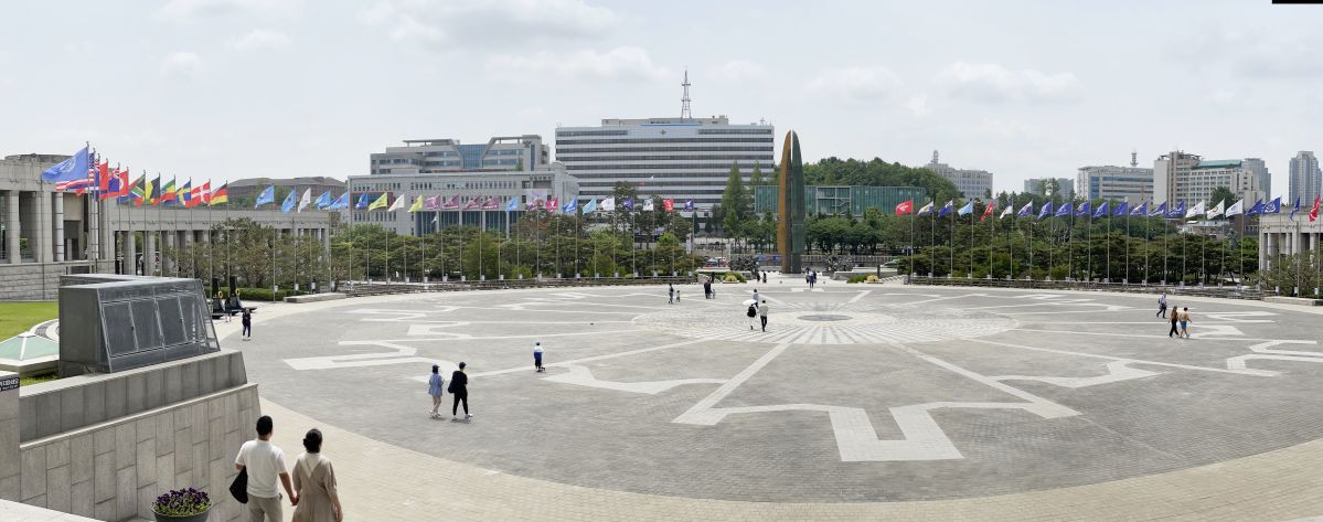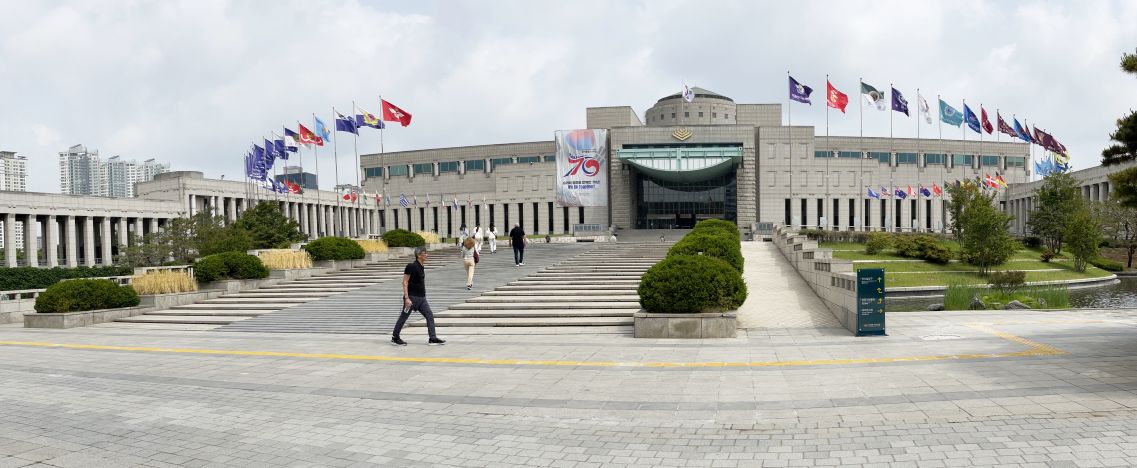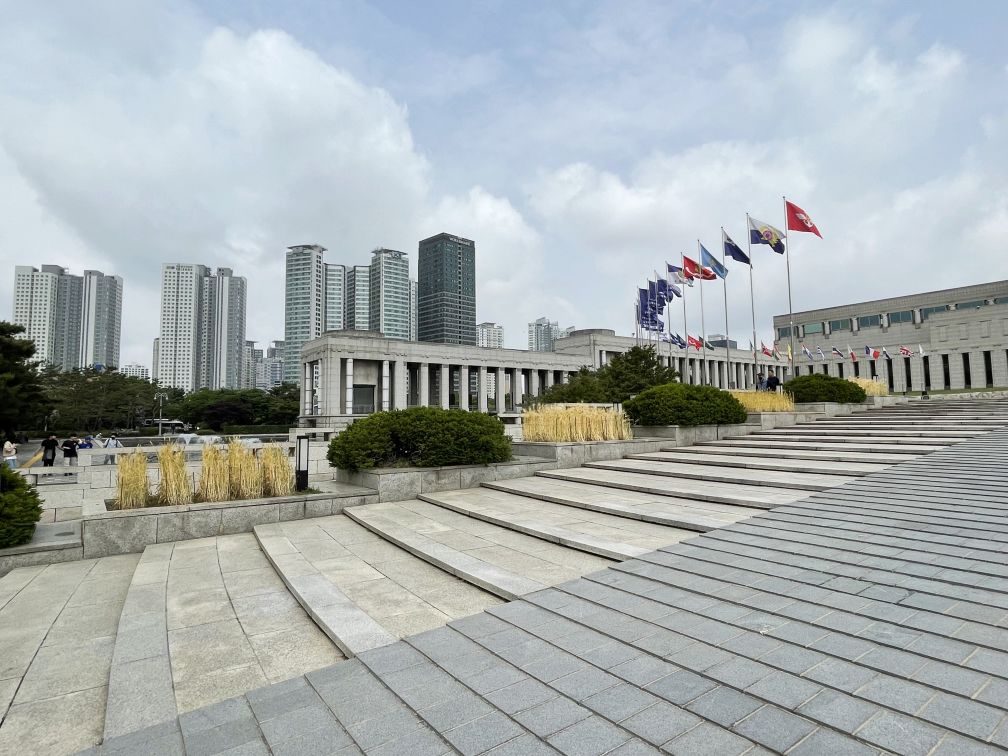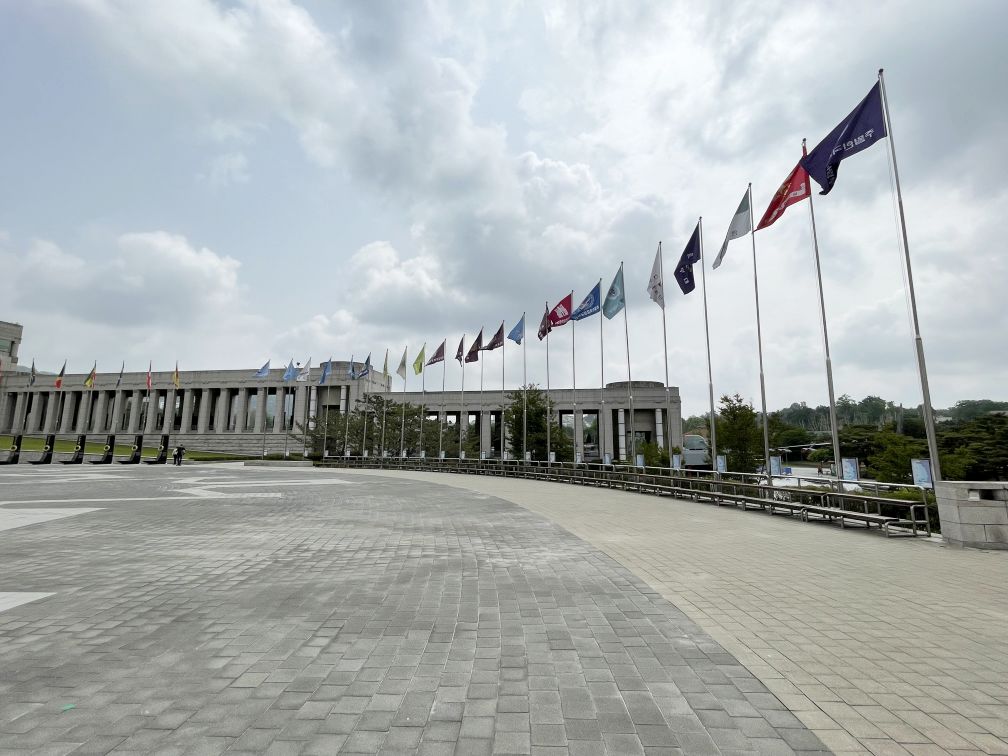 View from the Peace Plaza at the main building with the flags of the Nations that participated in the Korean war.