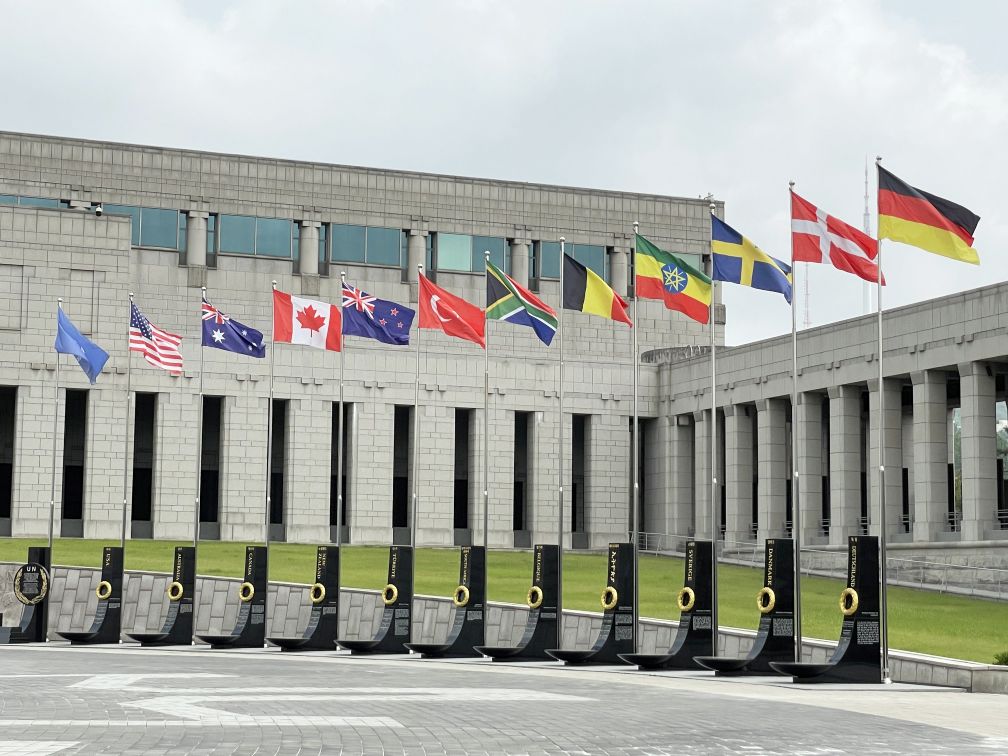 Flags of the Nations that participated in the Korean war surrounding the main building.
