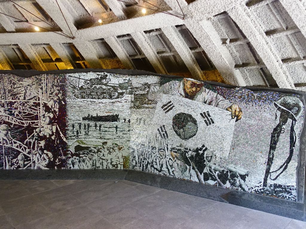 Inside the lower section of The Statue of Brothers is a mosaic wall painting that shows the spirit of the Korea people and the 16 United National countries that came to the aid of South Korea.