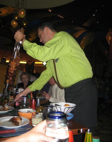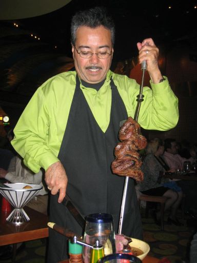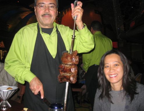 Hoa and Kevin glanced at the menu and decided to go with the all you can eat Rodizio Experience. Rodizio is the ultimate all you can eat barbecue, offering unlimited portions of marinated meats, poultry, and seafood. Rodizio is a uniquely Brazilian style of barbecue offering a wide variety of flavors. Each course is skewered and slowly roasted over coals in a special Brazilian rotisserie. |