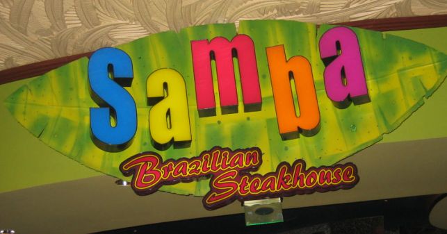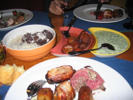 The meats are served with traditional side dishes of black beans and rice, sweet fried plantains, creamed spinach, carrots, and a bowl of “Samba Salad” tossed. |