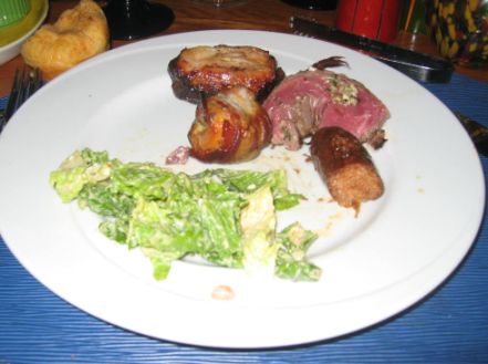 Basically the all you can eat menu consist of: Slow cooked Sausage and Sweet Peppers. Honey Brushed Turkey Breast Roulade Wrapped in Bacon, Huli Huli Chicken Hawaiian Style, Churrasco Sirloin “Picanha” Style, Brazilian Style Baby Back Pork Ribs, “Alho” Style Chicken Legs, Ginger Soy Flank Steak, Slow Roasted Pork and Pineapple.