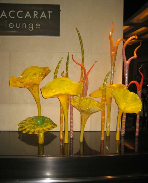 Beautiful blown art glass are displayed on the outside of the Baccarat lounge. |