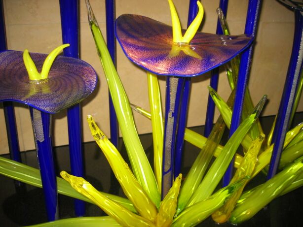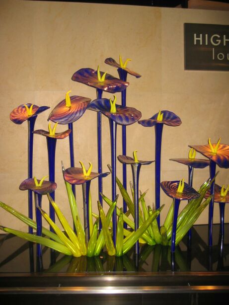 These blown art glass flowers are displayed on the outside of the high roller lounge. |