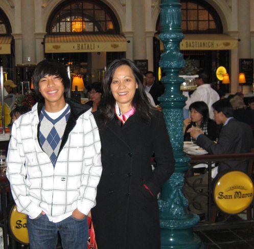 Standing in front of the restaurant. In the background you can see Batali and Bastianich (Mario's partner and son of Lydia Bastianich, the famous cook) |
