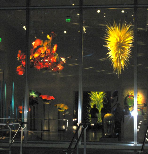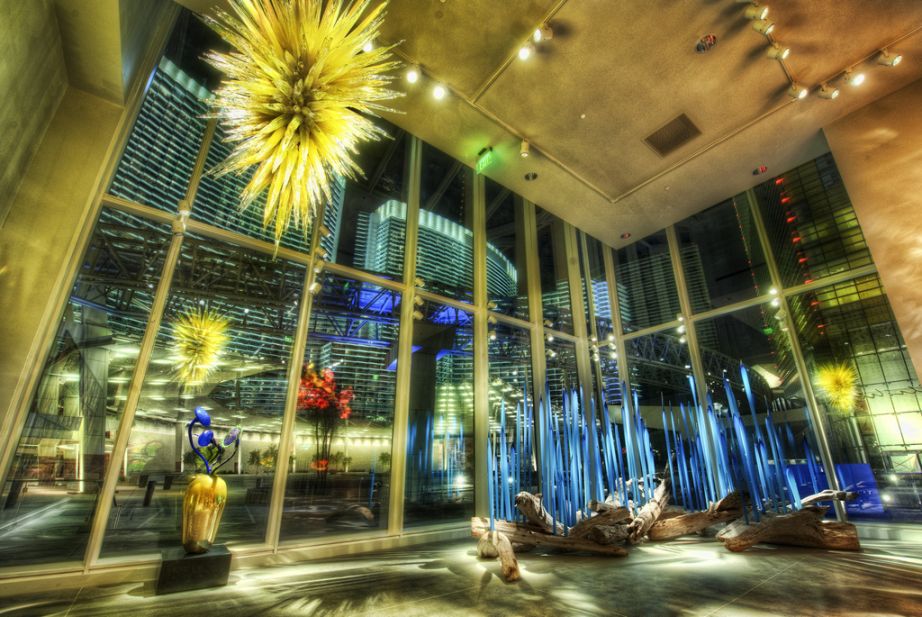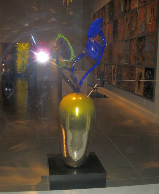 Chihuly’s CityCenter exhibition highlight a number of his important works including the dramatic Lime Green Icicle Tower (top left) and an indigo-blue neon sculpture (on the bottom right).