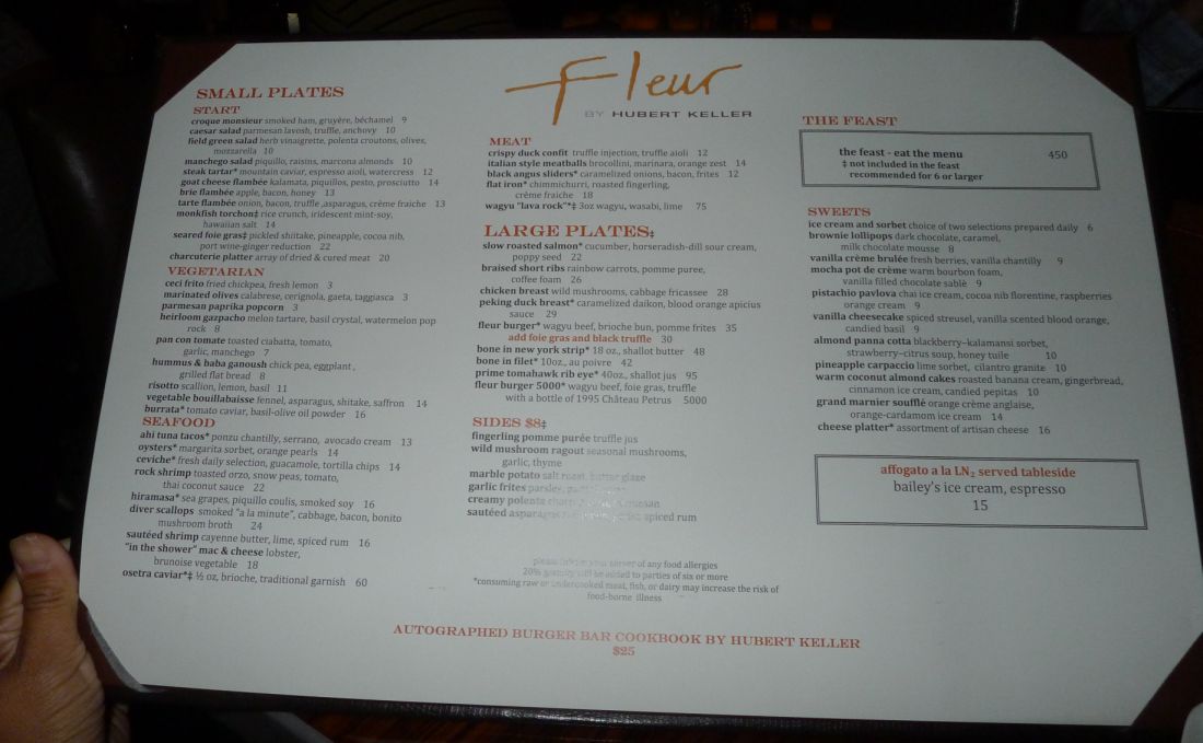 The menu with an interesting note on the right corner: The Feast- eat the (whole) menu for $450 or in the middle on the menu under LARGE PLATE : Fleur burger 5000 made with wagyu beef, foie gras, truffle with a bottle of 1995 Chateau Petrus for a mere $5,000!