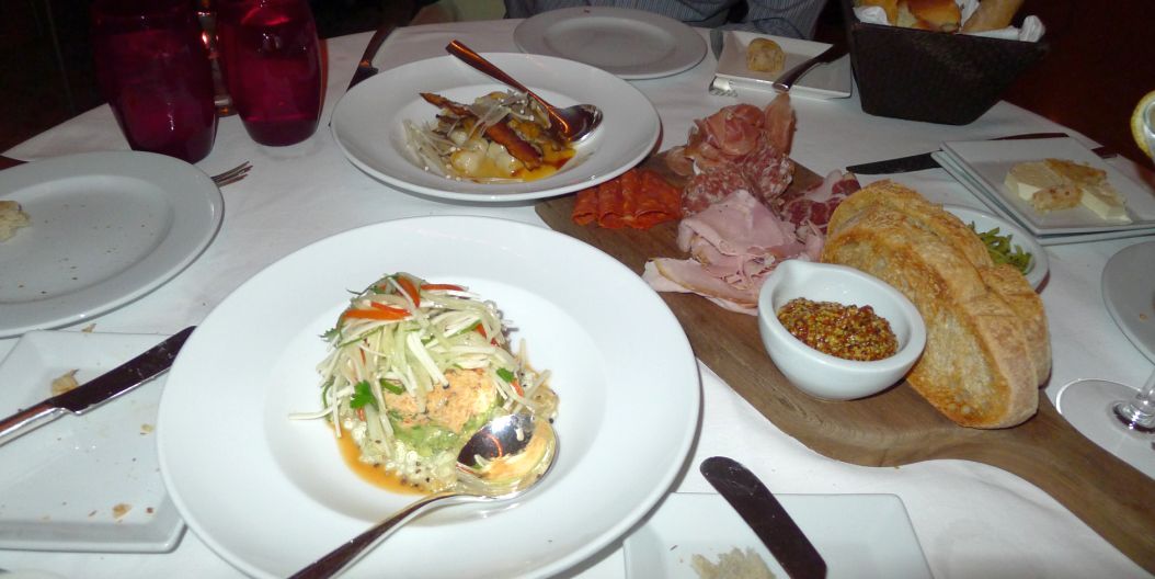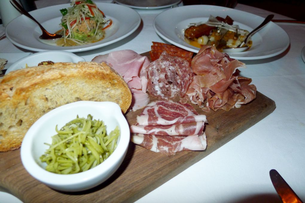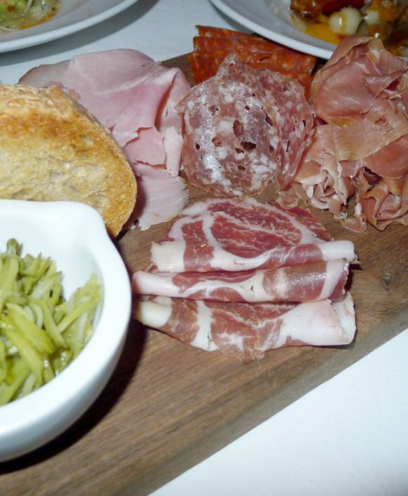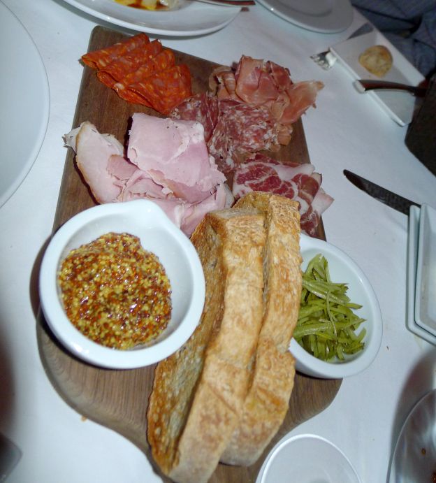Charcuterie Sampler: San Daniel secolo prosciutto, Italian rosemary cotton ham, and assorted dried sausages.