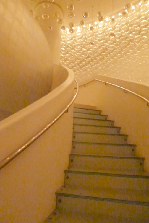 Going up are white stairs leading to a private dining room with tables for large parties. |
