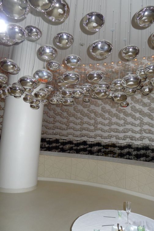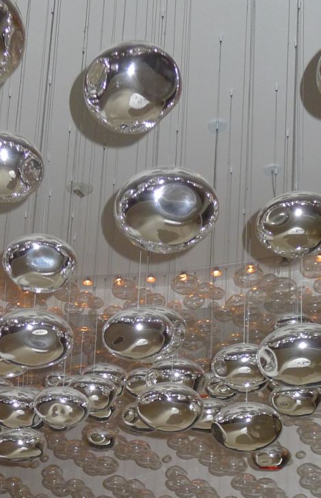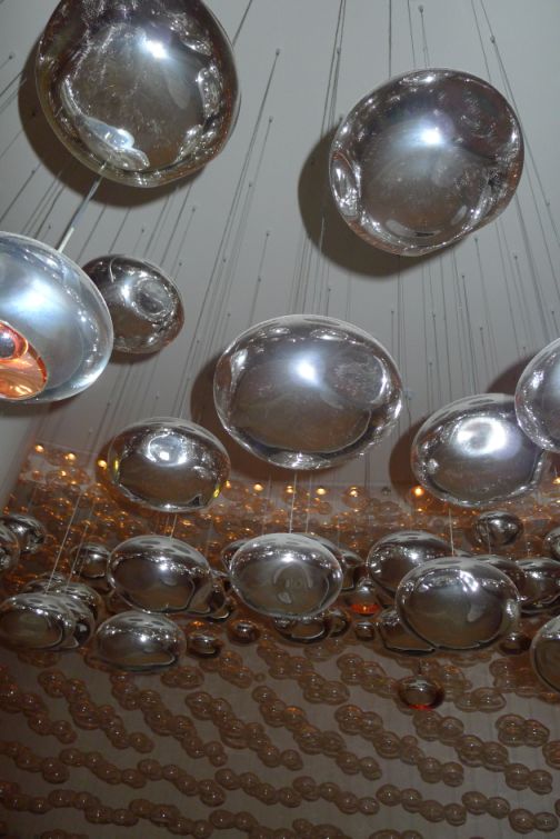 On the ceiling are hand blown silver pod lamp shades. |