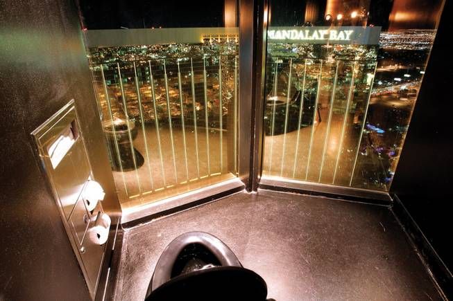 The toilet bowls face backward, looking out at the glass windows from floor-to-ceiling so when you're sitting there doing your business, you're looking out over the beautiful Vegas Strip.
