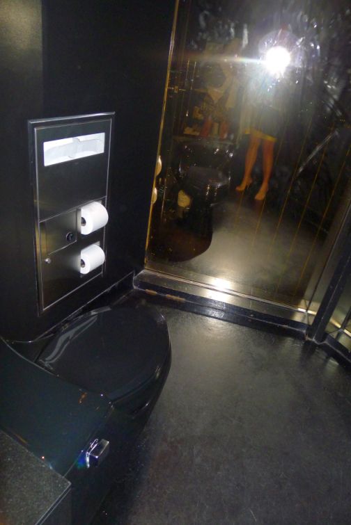 The bathroom is totally dark, with a single light shinning down over the toilet bowl, other than that the room is in complete darkness. As you open the door you will be surprised to see the glittering lights of the city.