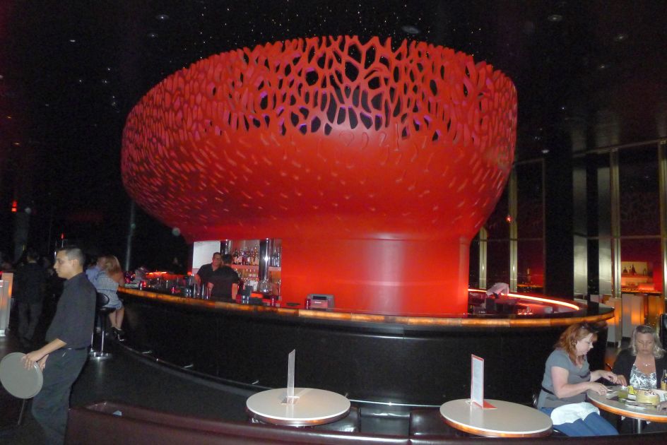 As you exit the elevator you pass by the kitchen and then enter a sumptuous black lounge and in the center a huge oval bar that catch your sight right away. The massive molded core of the bar is designed to look like red coral. On the ceiling above the "coral" is a fiber optic field that shimmers like the night sky.