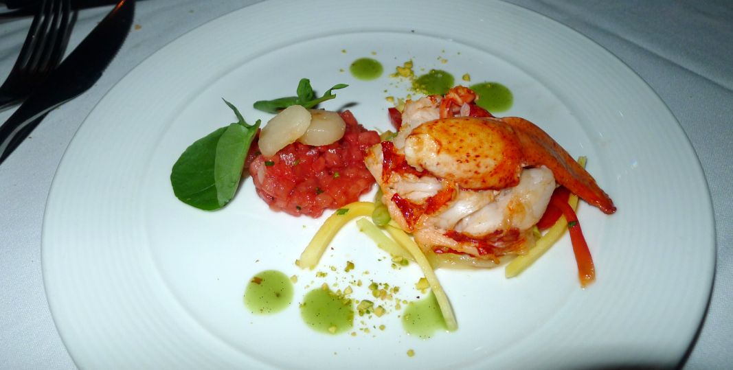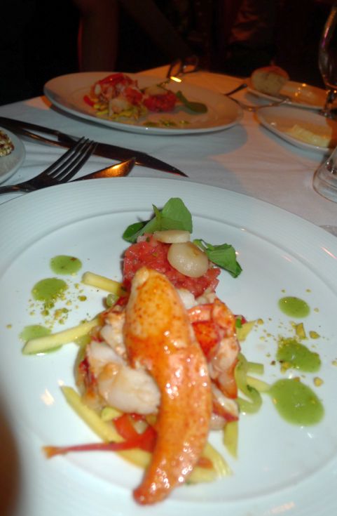 Course 1: Maine Lobster Salad with watermelon tartar, water chestnuts and pistachio Vinaigrette.