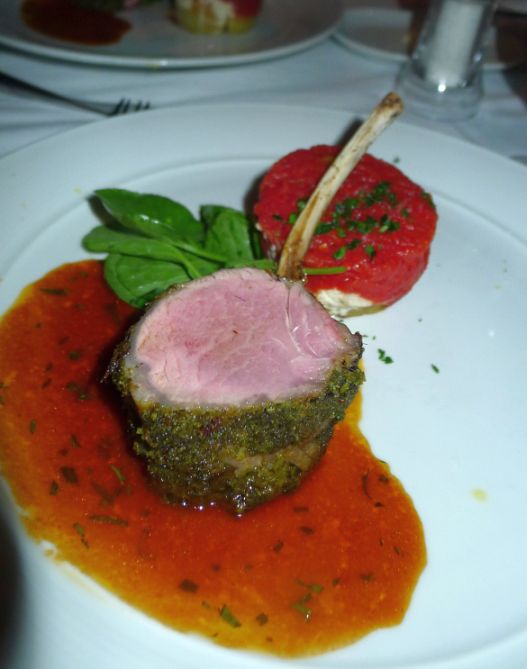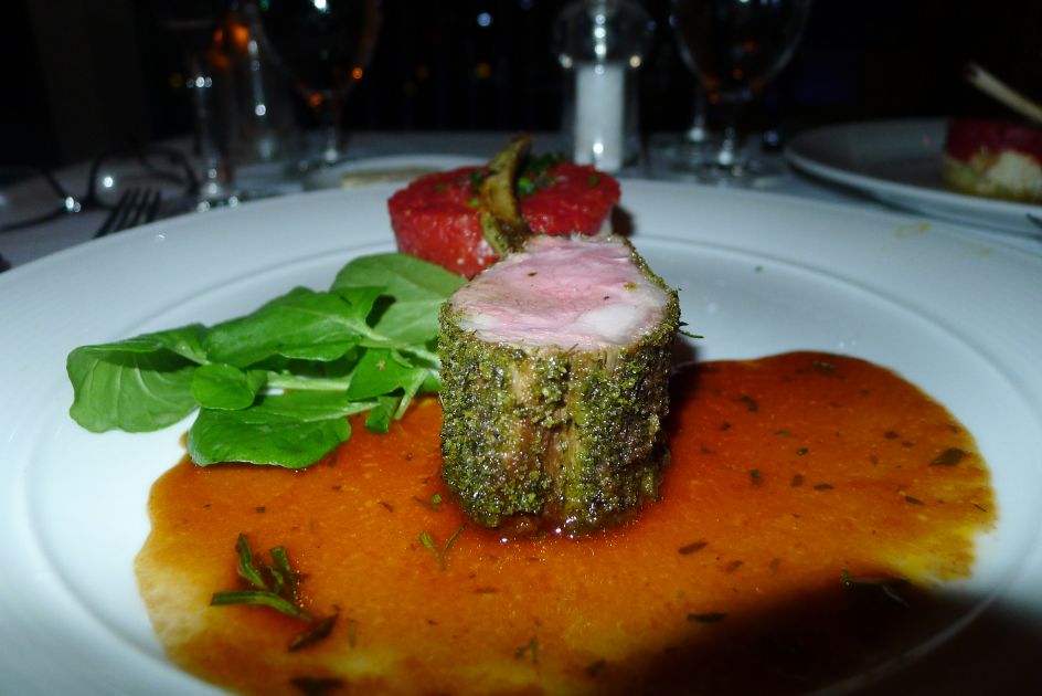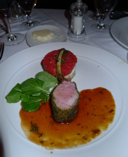 Course 4: Roasted Rack of Lamb with tomato tart and Tarragon jus.