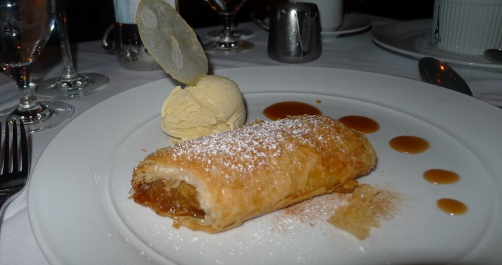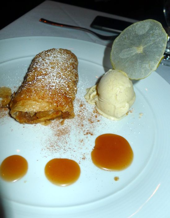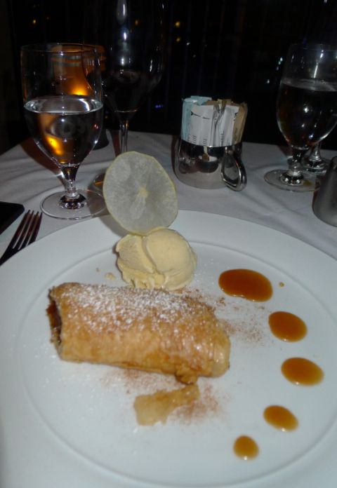 Hoa ordered a warm Baked Alsace Apple Strudel with Cinnamon Ice Cream